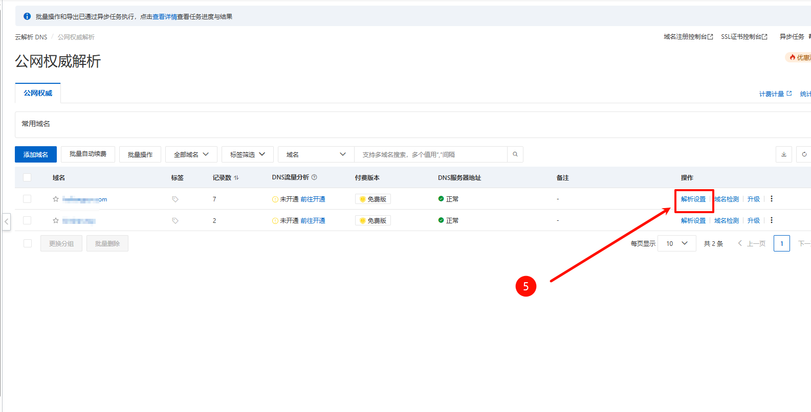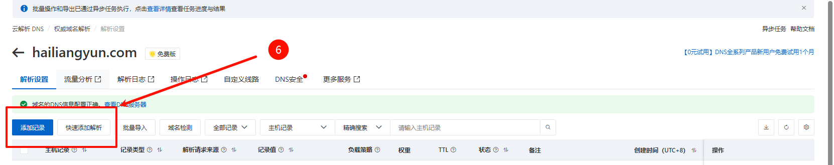 ## 阿里云DNS解析域名 https://dnsnext.console.aliyun.com/authoritative ### 1.访问以上网址进入阿里云DNS解析服务,点击添加域名  ### 2.在添加域名弹框添加一级域名(不加前缀),点击确定  ### 3.在添加的域名后面点击解析设置  ### 4.点击“添加解析”或“快速添加解析” > 快速添加解析更加简单,对新手更加友好  ### 5.点击“添加解析”,如果解析的是网站可根据以下指引进行填写 **①记录类型**:如果是解析网站就选 `A--` ,如果是邮箱就选 `MX--` **②主机记录**就是域名前缀,常用主机记录及含义如下: www表示域名 www.你的域名.com(网站的话默认选这个) @表示主域名 你的域名.com *泛解析,表示满足格式 *.你的域名.com 的所有域名 mail表示域名 mail.你的域名.com,常用于邮箱业务的解析设置 m表示域名 m.你的域名.com ,常用于手机网站 二级域名,如abc.你的域名.com,则写abc 多级域名,如ab.cd.你的域名.com,则写ab.cd **③记录值**:填入你的服务器公网IP地址 填完点击**确定**  ### 6.到此DNS解析完成,一般10分钟左右生效,最短不到一分钟就生效了,如果需要验证是否生效,按以下操作 ### 7.点击主机记录为 `www` 的主机记录最后面的图标,会有个`生效检测`,点击`生效检测`  ### 8.点击生效检测进入网络拨测工具,自动进行测试是否生效  ### 9.如生效检测结果会生成一条结果,说明解析已生效,就可以用域名正常访问网站了